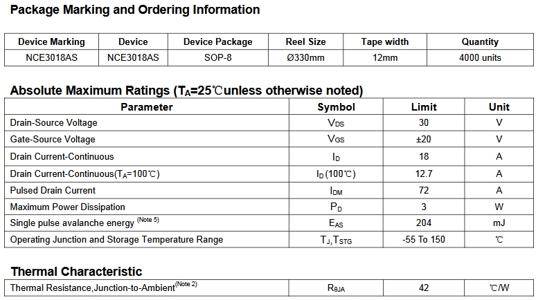 NCE3018AS采用先进的沟槽技术和设计,以低栅极电荷提供优异的Rps(on),可用于多种应用。