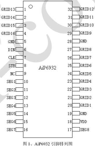 AiP6932是一款由无锡中微爱芯电子有限公司生产的3线串口共阴极8段16位LED驱动控制专用电路。这款芯片在LED显示面板场合有着广泛的应用,如电磁炉、电饭煲、空调、机顶盒等家电产品的显示。本文将详细介绍AiP6932的引脚功能,为工程师和设计师提供全面的技术参考。
