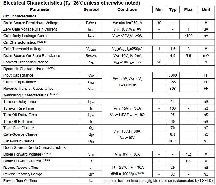 RDS(ON)在电压为10V时小于5.5mΩ(电压为4mΩ)