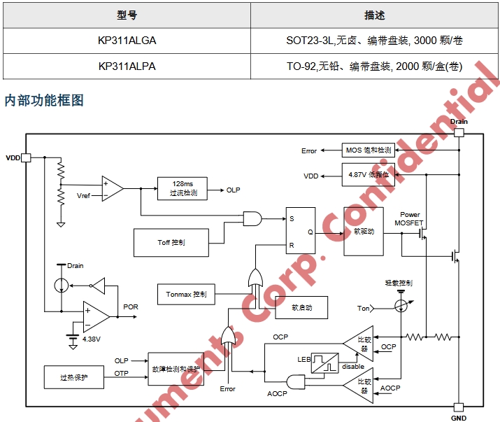 KP311AWPA具备一系列智能控制和?;すδ?,确保了芯片在各种工作条件下的稳定性和安全性。芯片内部设计有软启动电路,能够在启动时逐渐增加过流保护阈值,避免了启动瞬间的电流冲击。此外,还集成了VDD欠压?;?、逐周期电流限制、异常过流?;?、过热保护、过载保护等多种保护功能,全方位保障了芯片及外部电路的安全运行。