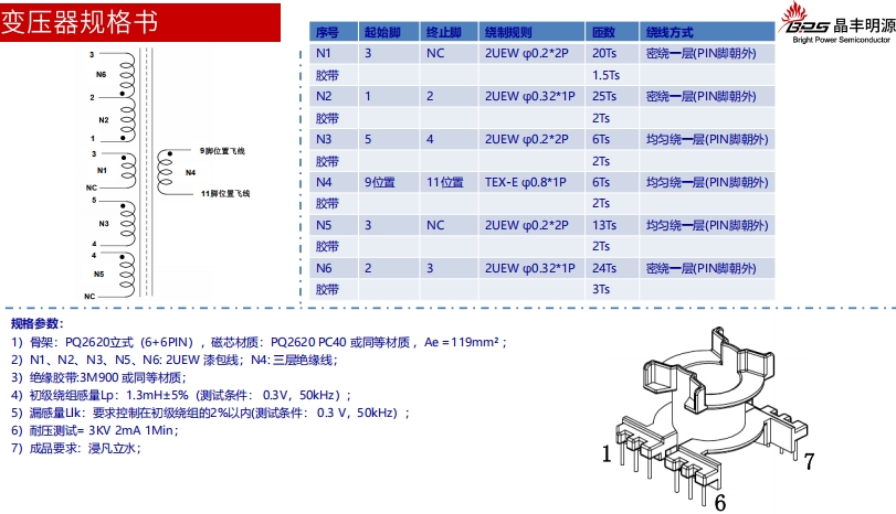 骨架:PQ2620立式(6+6PIN),磁芯材质:PQ2620 PC40或同等材质,Ae=119mm2