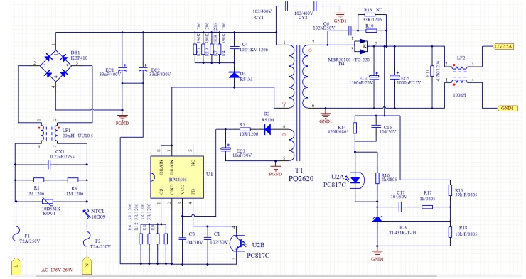 控制芯片:U1(BP84505BP),U2(PC817C),IC3(TL431K-T-03)