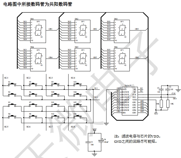 显示模式(8 段×6 位),支持共阳数码管输出