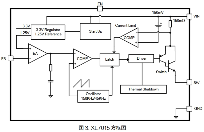 XL7015是一款高效、高压降压型DC-DC转换器,固定150KHz开关频率,可提供最高0.8A输出电流能力,低纹波,出色的线性调整率与负载调整率。XL7015内置固定频率振荡器与频率补偿电路,简化了电路设计。PWM 控制环路可以调节占空比从0~90%之间线性变化。内置输出过电流?;すδ?,当输出短路时,开关频率从150KHz降至45KHz。内部补偿??榭梢约跎偻馕г骷俊D诓靠蚣芡既缦聗