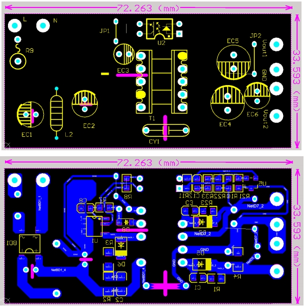 实物图展示了BPA8604D电源模块的紧凑结构和简洁布局。整个电路板采用了单面板设计,尺寸仅为72mm×33.5mm,适合安装在空间有限的设备中。电路板上的元件布局合理,走线清晰,便于生产制造和维修。通过实物图,我们可以直观地感受到BPA8604D电源模块的高效能和可靠性,其简洁的设计理念和精湛的制造工艺,使其成为了现代电源设计的典范之作。