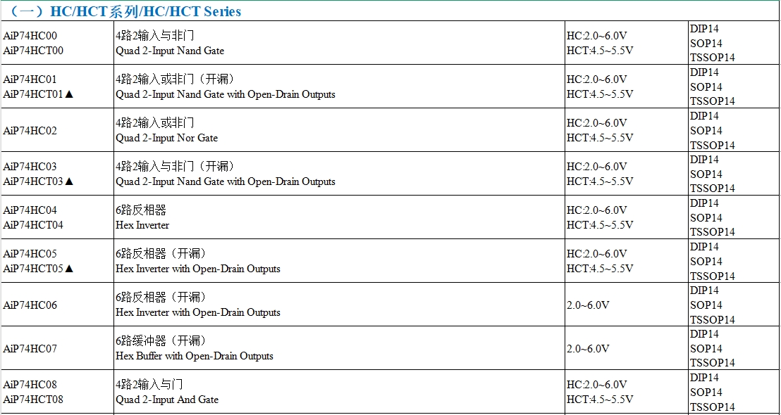 LV(低电压)和LVC(低电压CMOS)系列适用于低功耗和低电压应用。国产AiP74LV系列和AiP74LVC系列提供了与ON Semiconductor等厂商相同的功能和性能。例如,AiP74LV04(6路反相器)与ON Semiconductor的MC74LV04在工作电压(1.65~5.5V)、传播延迟(5ns)和封装形式(DIP14, SOP14, TSSOP14)上完全兼容。