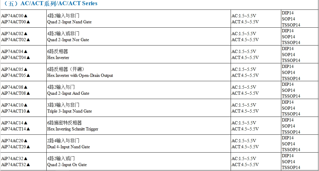 AC(先进CMOS)和ACT(先进CMOS TTL兼容)系列适用于高速应用。国产AiP74AC系列和AiP74ACT系列在高速性能上与进口产品相当。例如,AiP74AC00(4路2输入与非门)与TI的SN74AC00在工作电压(1.5~5.5V)、传播延迟(3ns)和封装形式(DIP14, SOP14, TSSOP14)上完全兼容。