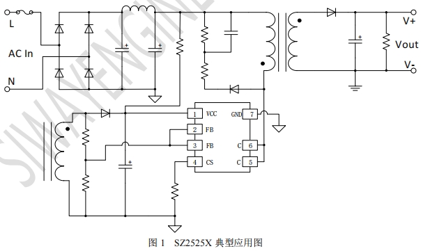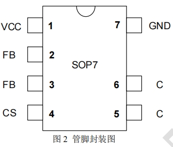 SZ2525X 采用 SOP7 封装,这种封装形式具有体积小、散热性能好等优点,非常适合应用于空间有限的电子设备中。其封装尺寸精确,引脚布局合理,便于在 PCB 上进行安装和布线。此外,芯片的管脚设计也充分考虑了实际应用的需求,例如 VCC 管脚需要就近接旁路电容,以确保电源的稳定供应;CS 管脚用于电流采样,能够精确地检测输出电流;FB 管脚则用于反馈电压输入,通过与内部基准电压的比较来实现恒压控制。