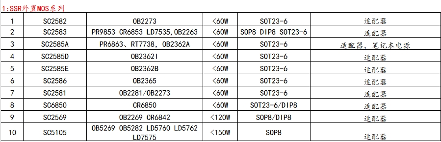 SSR内置MOS系列是鼎芯微电子推出的另一类高效电源管理芯片,适用于适配器、小家电等应用场景。以下是该系列部分型号及其替代型号: