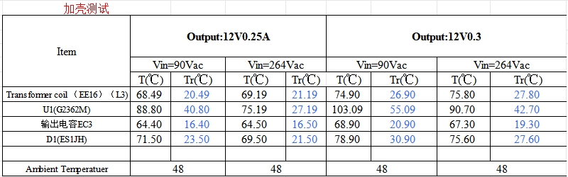 温升测试结果显示,两款芯片在满载运行时,关键部件的温度上升均在安全范围内。例如,变压器线圈(EE16)的温升在73℃至75.5℃之间,远低于其最高工作温度,确保了产品的长期可靠性。