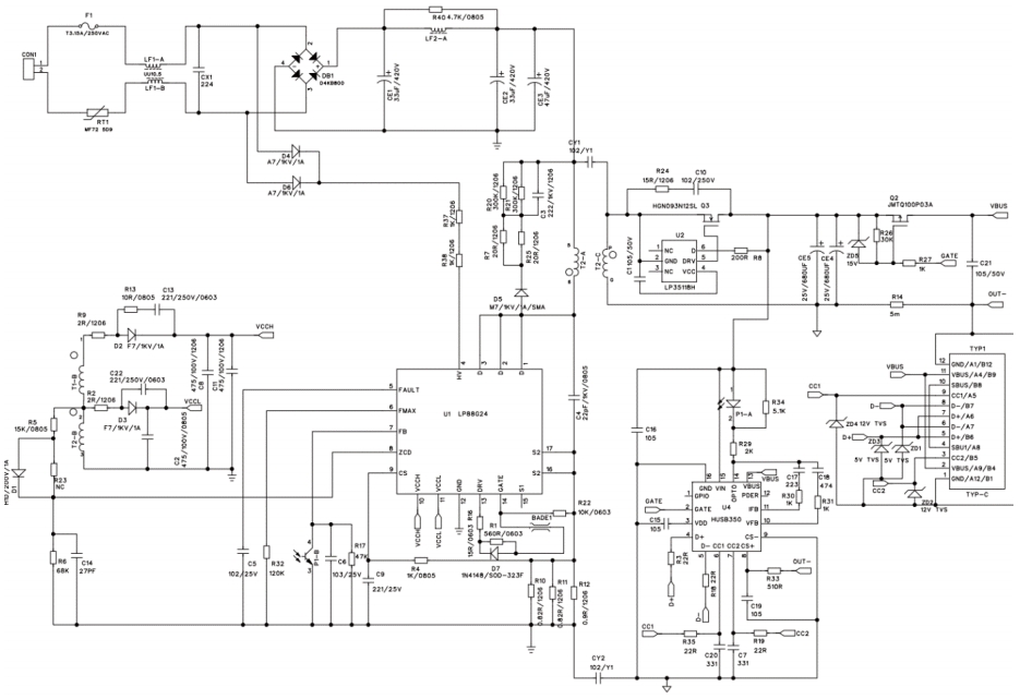 在这一背景下,芯茂微电子凭借其在电源管理芯片领域的深厚技术积累和创新能力,推出了合封氮化镓LP88G24DCD的PD65W适配器参考设计。这一设计充分展现了GaN技术的优势,同时也体现了芯茂微电子在电源管理芯片设计上的先进理念。