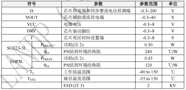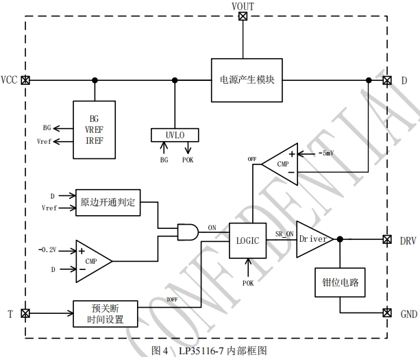 在电气参数方面,LP35116-7 表现卓越。其 VCC 工作电压范围为 5.8V 至 6.4V,启动电压为 4.3V 至 4.7V,欠压?;ゃ兄滴?3.8V 至 4.2V。整流管的开通电压阈值为 -0.25V 至 -0.15V,关断阈值为 -8mV 至 -2mV。驱动能力方面,其驱动电压最大值为 6V,驱动脚出电流典型值为 1.5A,入电流典型值为 4A,上升时间为 25ns,下降时间为 10ns。这些参数确保了芯片在高效率和快速响应之间的良好平衡。