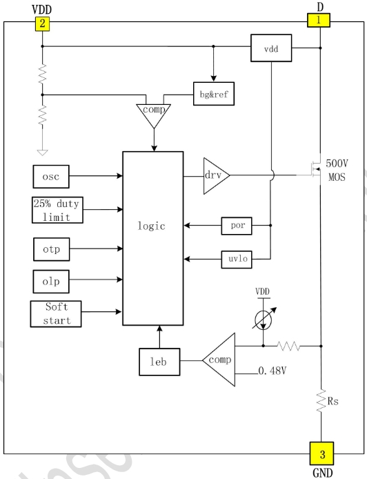 WS7205能够逐周期检测系统输出电压,并与VDD电压进行比较,以精确调制系统输出电压。如果输出电压大于VDD电压,则本周期的开关信号被屏蔽,高压功率管不开启;反之,如果输出电压小于VDD电压,则本周期PWM信号正??艄β使?,确保输出电压的稳定性。