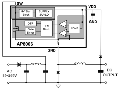内置高压启动电路:无需外部启动电路,简化了设计,降低了成本。