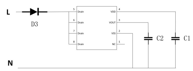 | 5,6,7,8 | Drain | 电源 | 内部功率MOSFET漏极,为VDD供电 |