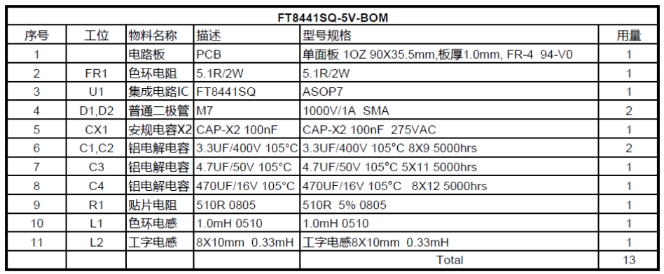 以下是该5V250mA开关电源方案的主要物料清单: