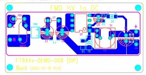 以下是基于 FT8443BD2 的 18V500mA 恒压输出电源的 PCB 布局示意图。元件分布合理,走线清晰,便于生产和调试。