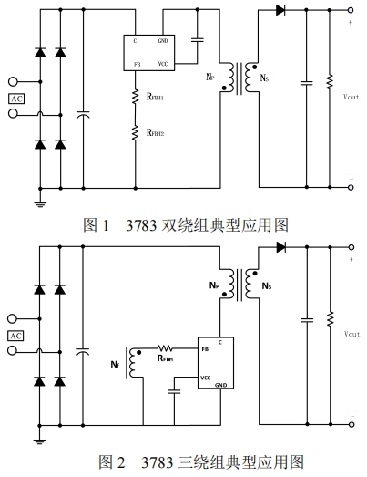 三绕组应用是3783系列芯片的另一种典型应用方式,其典型应用电路如图2所示。在这种应用中,3783芯片的FB脚通过变压器辅助绕组和FB脚的外置电阻反馈输出电压,与内部基准比较形成闭环,从而恒定输出电压。