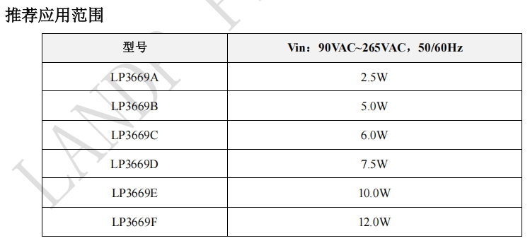 LP3669系列提供了从2.5W到12.0W的多种输出功率选择,能够满足从低功耗到高功耗设备的不同需求。这种多样化的功率选择使得工程师可以根据具体应用场景选择最适合的型号。