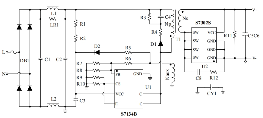 S7134B芯片(U1)是整个电路的核心,它通过检测输出电压和电流,自动调整开关管的导通时间,从而实现恒压恒流的控制功能。芯片的VCC引脚连接到一个辅助电源,为其提供工作电压;FB引脚则用于接收反馈信号,以实现精确的电压和电流调节。