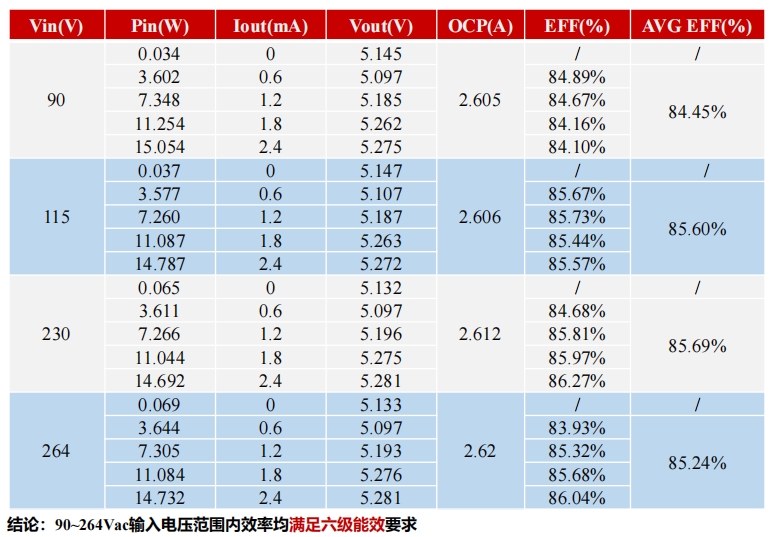 在90Vac至264Vac的输入电压范围内,S7134B芯片的效率均满足六级能效要求。具体数据如下表所示: