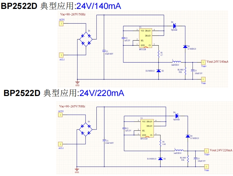 以BP2522D为例,持续输出240mA,脉冲350mA,电感量为470uH,电感电流纹波为57mA。最大峰值电流为579mA,BP2522D内部MOS管限制最大电流为750mA,留有一定余量,可取Rcs=0.3ohm。