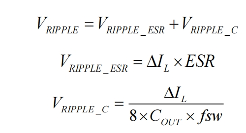 输出电容的选择对输出电压纹波、系统动态响应、环路稳定性、输出电压过冲等有直接影响。在恒定输出电流的CV模式下,输出纹波主要由输出电容的等效串联电阻(ESR)和容量决定。纹波计算公式为: