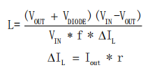 BP2522D可工作于连续导通模式(CCM)、不连续导通模式(DCM)等多种模式。电感选择需综合考虑感量、峰值电流和平均电流。小感量电感能减小尺寸、降低成本并改善动态响应,但会增大峰值电流和输出纹波,降低系统效率。大感量电感可提高效率,但尺寸较大,动态响应较慢。实际应用中,需综合考虑动态响应、电感尺寸、效率、实际带载电流和芯片温升等因素,选择合适的电感。电感计算公式为: