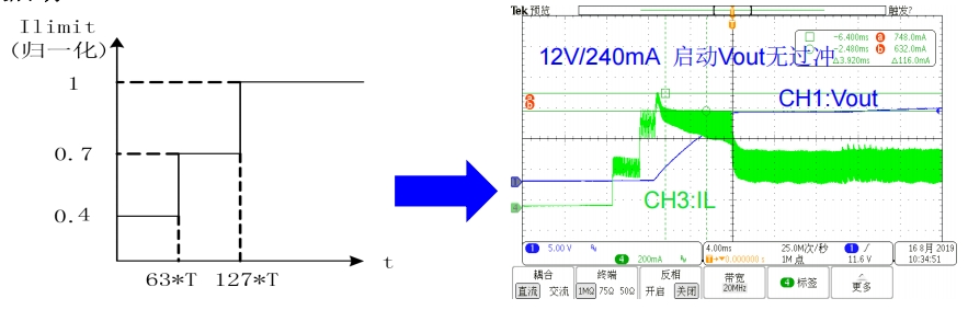 BP2522D具备软启动功能,通过分段增加峰值电流来减小开关应力,避免输出电压过冲现象。软启动分为三个阶段:第一阶段Ipk1=0.4Ilimit,第二阶段Ipk2=0.7Ilimit,第三阶段Ipk3等于设置的Ilimit。在重载下启动时,系统会触发降频模式,工作频率降为满载的1/4。