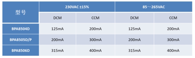 输出电流:在230VAC±15%条件下,可提供315mA(DCM)和400mA(CCM)的输出;在85~265VAC条件下,提供315mA(DCM)和400mA(CCM)。