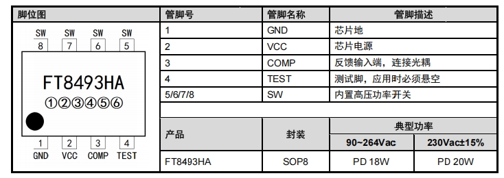 FT8493HA采用SOP8封装,各管脚功能如下表所示: