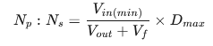 例如:90Vac输入,12V输出,肖特基压降0.5V,最大占空比0.45,则匝比≈8:1。