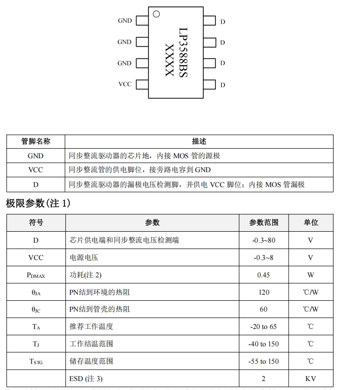 LP3588BS采用SOP8L封装,具有紧凑的尺寸和良好的散热性能。以下是其管脚功能描述: