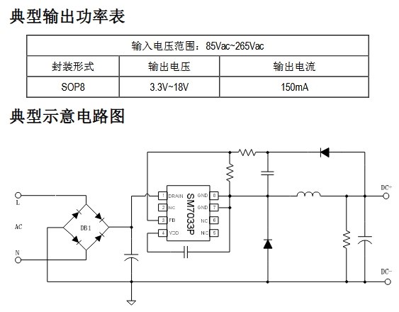 在 IoT 小家电、智能面板或传感节点里,工程师最怕的就是“待机电源”——功率不大,却占掉宝贵的 PCB 面积和 BOM 成本。明微推出的 SM7033PK,用一颗 SOP-8 封装就把 85-265 VAC 输入、3.3-18 V/150 mA 输出的恒压方案做到了极致精简:整流桥之后,只需 5 个外围元件即可上电运行,真正让“小体积”与“低成本”兼得。