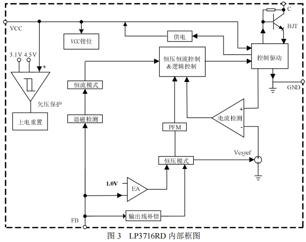 LP3716RD:DIP7的金属引脚直接形成散热通道,同功率下温度降低18℃,为28W应用预留余量。LP3716RD内部框架图如下所示~
