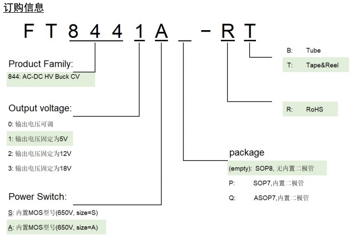 FT8441S:适用于 Buck 结构,持续输出电流为 250mA,封装形式为 SOP8。