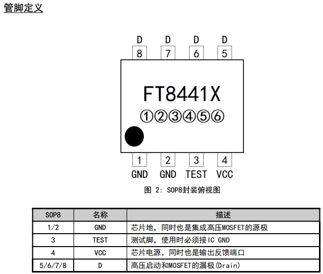 FT8441S 和 FT8441A 均采用 SOP8 封装,其管脚定义如下表所示: