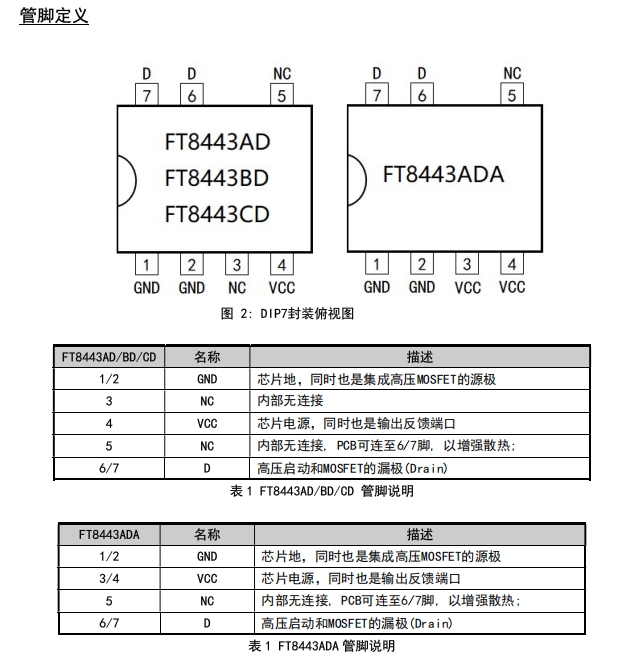 ? FT8443ADA:入门款,300 mA 稳态输出,650 V 内置 MOS,DIP-7 散热焊盘小,适合小家电、智能开关等成本敏感场景。