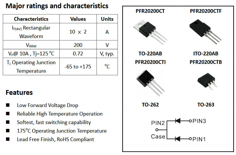 在中大功率开关电源、PFC 升压电路或逆变器次级整流中,总有一颗“黑扁”TO-220 封装器件被工程师们反复提到——它就是 PFR20200CTF。很多人第一次听到这个料号时都会疑惑:它到底是三极管还是 MOS?其实,它是一颗把“肖特基”和“MOS 结构”揉在一起的功率整流二极管,由 PFC Device Inc. 推出,主打 200 V/20 A、超低正向压降(Low VF)和快恢复特性,下面带你一次性把它摸透。
