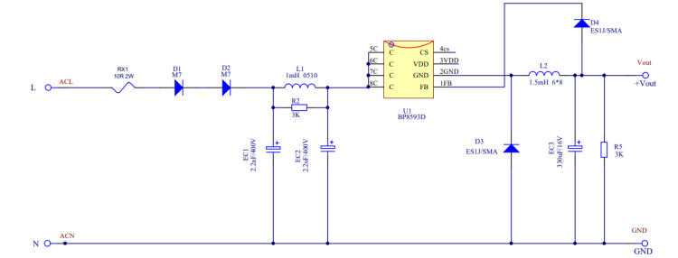在智能家居、小家电、MCU待机供电等超小功率场景中,非隔离辅助电源因成本低、体积小、设计简单而备受青睐。过去,OB2222E曾是这类100mA级方案的主流选择,但受限于交期、价格及EMI裕量,工程师急需一颗直接替换、性能更优的新品。BP8593D以 SOP7封装、内置700V MOS、PSR架构、<100mW待机功耗为核心卖点,官方参考设计5V/100mA已完整验证,BOM、PCB、测试数据一步到位,可实现零调试替代OB2222E。本文带你一图看懂这颗“小钢炮”。