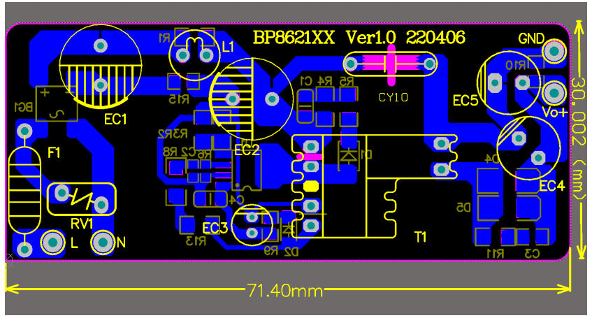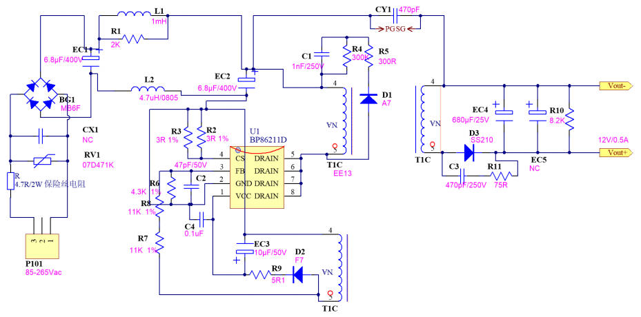 在 5 W-10 W 功率段的家电辅助电源里,工程师最想要的是:省器件、低成本、一次过 EMI、马上能量产。深圳三佛科技提供的 BP86211D 参考设计,用 单颗 SOP-7 芯片 + 650 V 集成 MOSFET,官方实测 12 V/0.5 A(6 W),待机功耗 < 65 mW,BOM 仅 24 颗器件,单面板即可过 CISPR22 Class B 传导。本文带你从特点、电路图、实物、BOM、变压器到测试数据,完整拆解这套“家用电器即插即用级”方案。