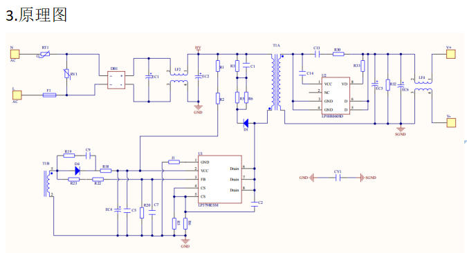 | U1 | LP3798ESM | ASOP6,650V SiC | 原边PSR |