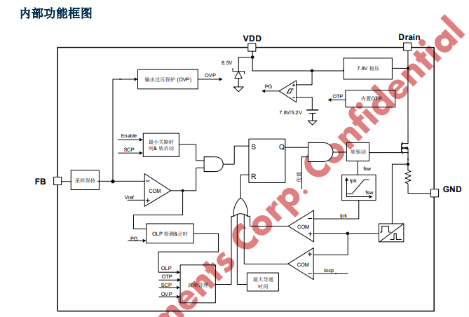 KP3114 集成有完备的带自恢复功能的?;すδ埽?VDD 欠压?;?、逐周期电流限制、输出过压?;ぁ⒐缺;?、过载保护和 VDD 过压保护等。