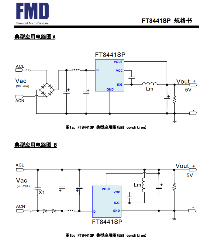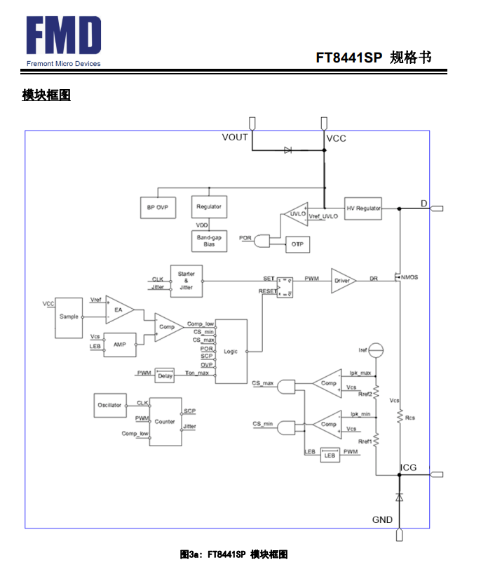 FT8441SP还集成了其他功能:VCC欠压?;ぃ║VLO)、VCC欠压保护(UVLO)、VCC过压保护(OVP)、过温保护(OTP)、逐周期过流保护(OCP)、输出短路保护(SCP),从而保证了系统的可靠性。