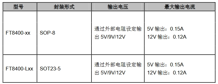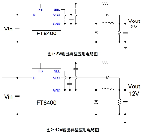 FT840X具有三种固定输出电压5V、9V和12V,可以通过SEL 脚进行设定。当SEL悬空时,输出为5V;当SEL接160Kohm电阻到地时,输出为9V;当SEL短路到地时,输出为12V。