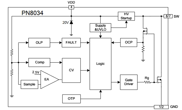 PN8034NSC-T1集成PFM控制器及650V高雪州能力智能功本MOSFET,用于外图元器件极精简的小功本非隔离开关电源。PN8034内置高压启动???,实现系统快速启动,超低待机功能。该芯片提供了完整的智能化?;すδ?,包括过流?;ぃ费贡;?,过温保护。另外PN8034的降频调制技术有助于改曾EMI特性。