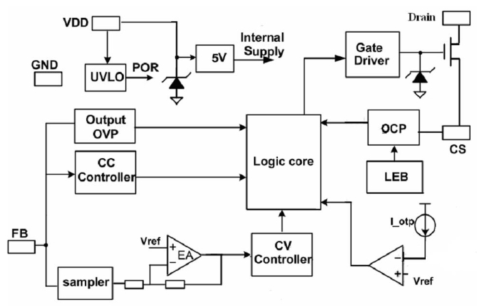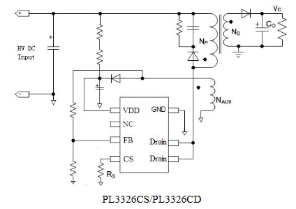 PL3326CS 是一系列高效率、高集成度、原边调节的 PWM功率开关,其主要应用于小于 15W 的 AC/DC 反激式开关电源。PL3326C 通过去除光耦以及次级控制电路,简化了充电器/适配器等传统的恒流/恒压的设计,从而实现高精度的电压和电流调节,内部框架图如下所示
