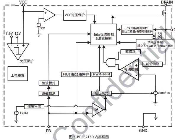 BP86213D 芯片集成650VMOSFET、高压启动和供电电 ?;すδ?nbsp;路。采用PWM/PFM多模式控制技术,从辅助绕组给VCO 输入欠压?;?Brown-in/out) 供电,能有效降低系统待机功耗,提高效率和动态性能, 并减小系统工作在轻载时的噪声。