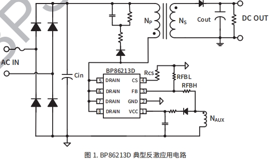 BP86213D是一款高集成度的低功耗PSR隔离CC/CV控 低待机功耗<75mW 制芯片。芯片工作在电感电流断续导通模式,适用于 集成高压启动和供电电路 85Vac~265Vac全范围输入电压的隔离反激电源。