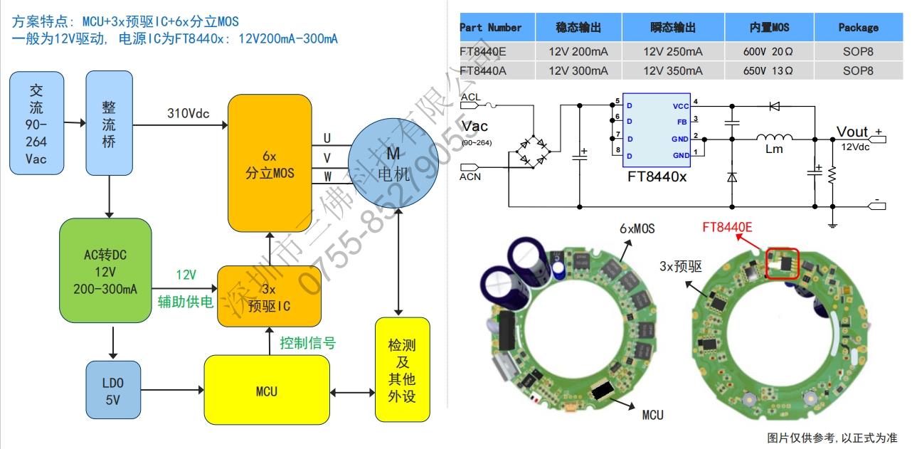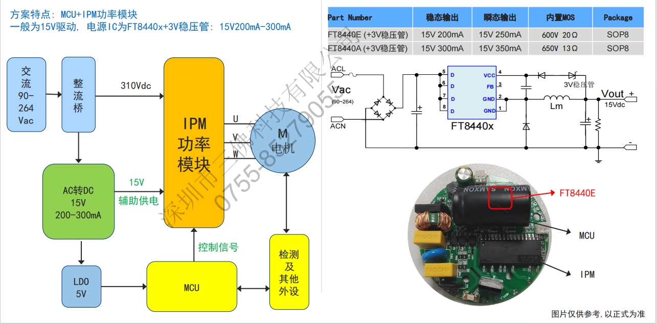 方案特点:MCU+IPM功率??橐话阄?5V驱动,电源1C为FT8440x+3V稳压管:15V200mA-300mA